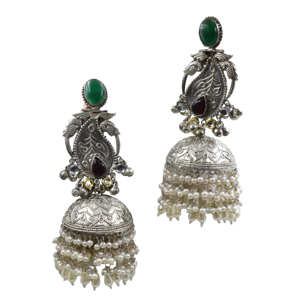 Beautiful handmade stud earing Long size party wear green stone white pearl brass silver look alike kundan jhumka earrings