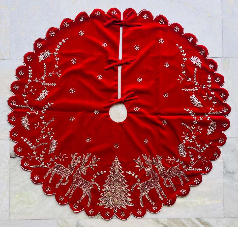 Beautifully Made Christmas Tree Skirt with Beaded Embellishments Offering a Timeless Touch to Your Elegant Holiday Setting