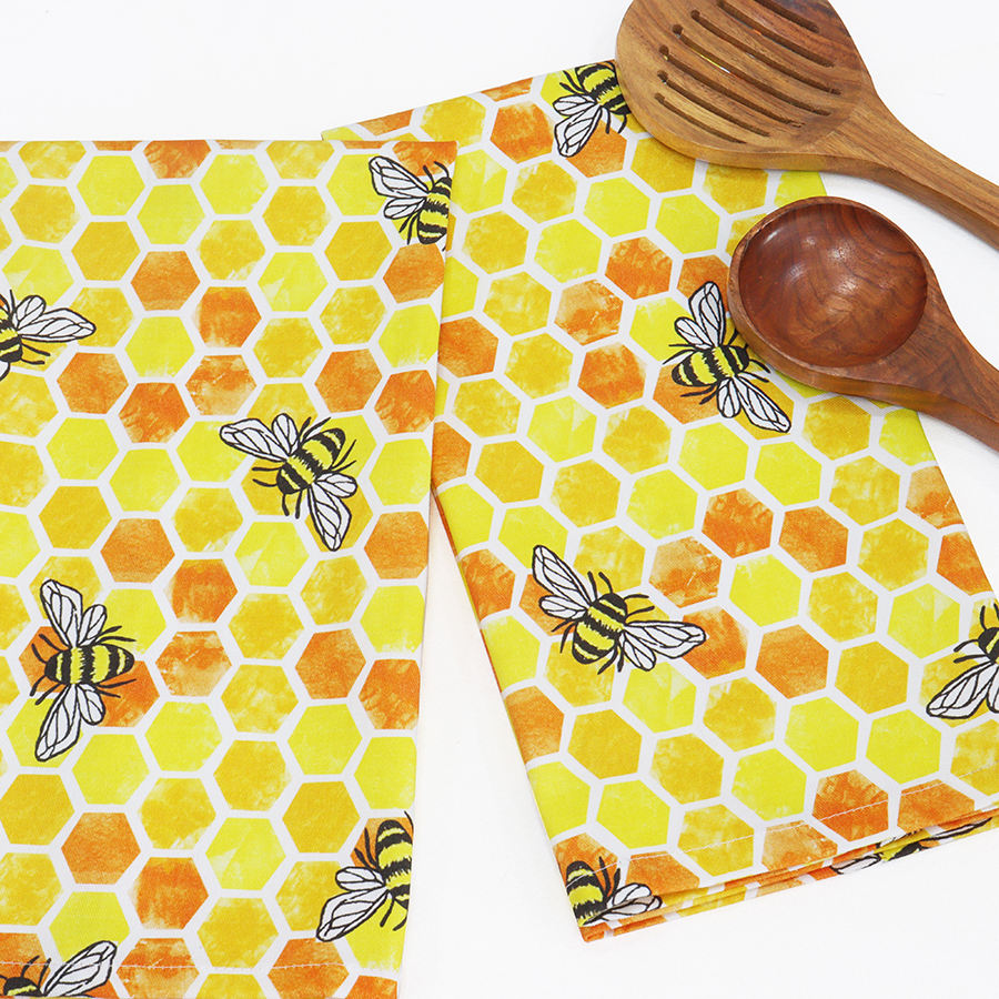 Bee Kitchen Towels 100% Cotton 16x26 Inch Printed Honey Comb Bee Summer Spring Easter Seasonal Yellow Machine Washable Kitchen