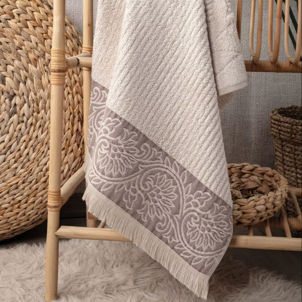 Beige Bamboo Jacquard Terry Towel 50*90cm 70% Bamboo 30% Cotton Blend Extra Soft High Absorbency Decorative Sevim Style 500 GSM