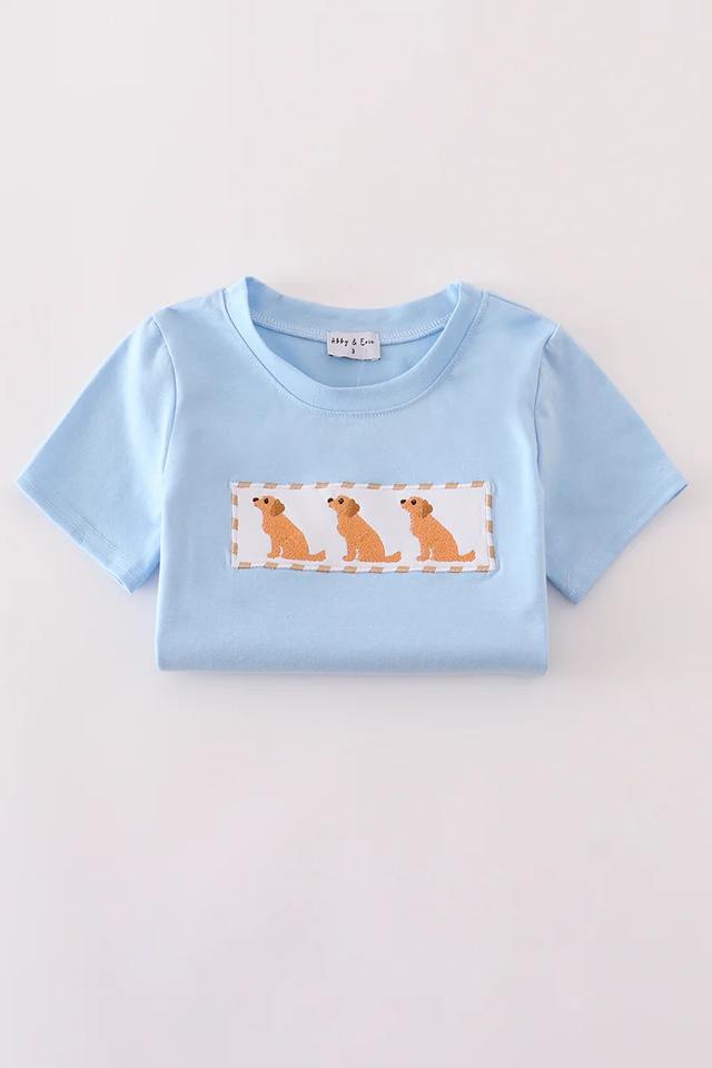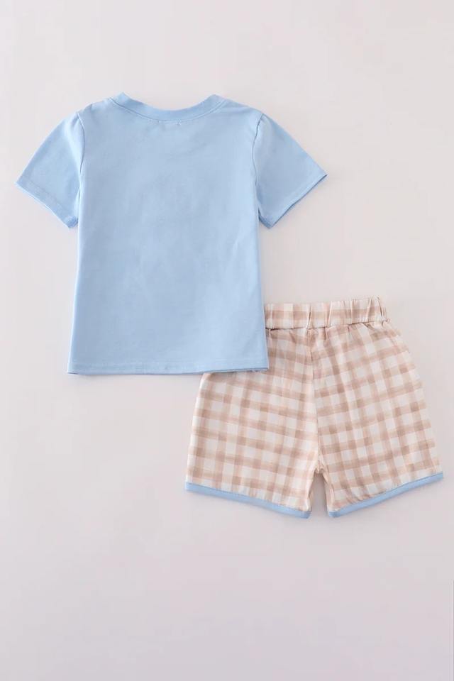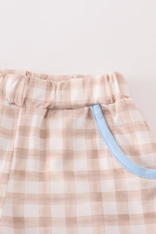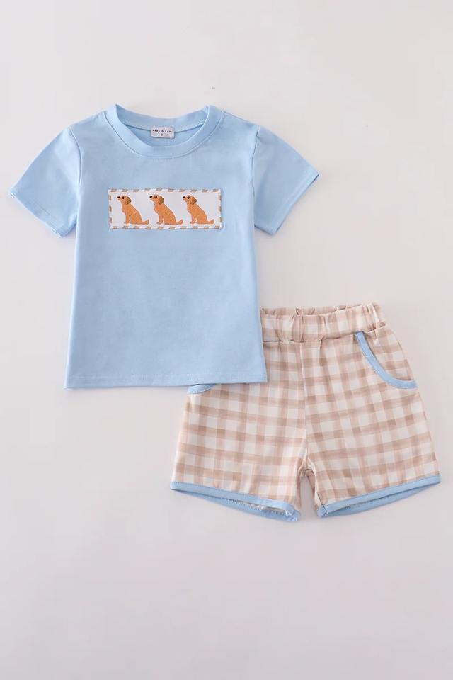Beige Gingham Shorts Set for Boys Summer Comfortable Kids Outfit with Cute Puppy Design Embroidery Solid Pattern