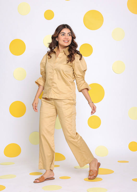Beige Solid Western Co-ord Set Relaxed Shirt and Pant With Waist Tie up Belt and 2 Pockets Available Big Size At Wholesale