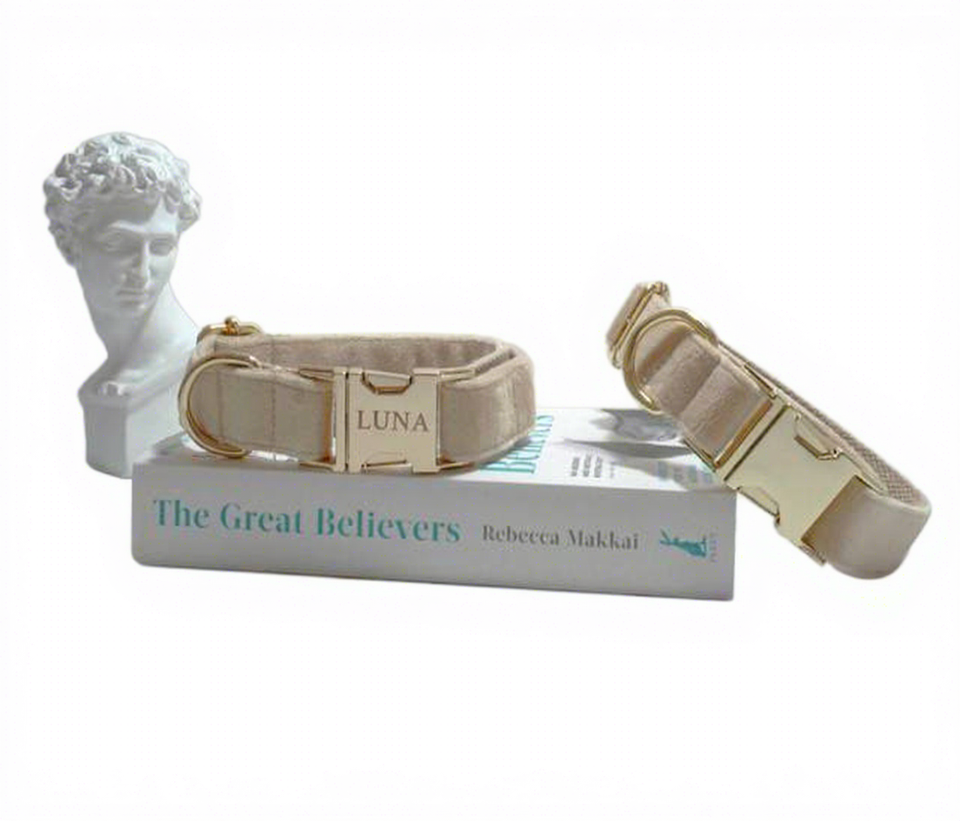 Beige Veet Personalized Dog Collar And Leash Bow Tie Set, Free Name Engraving