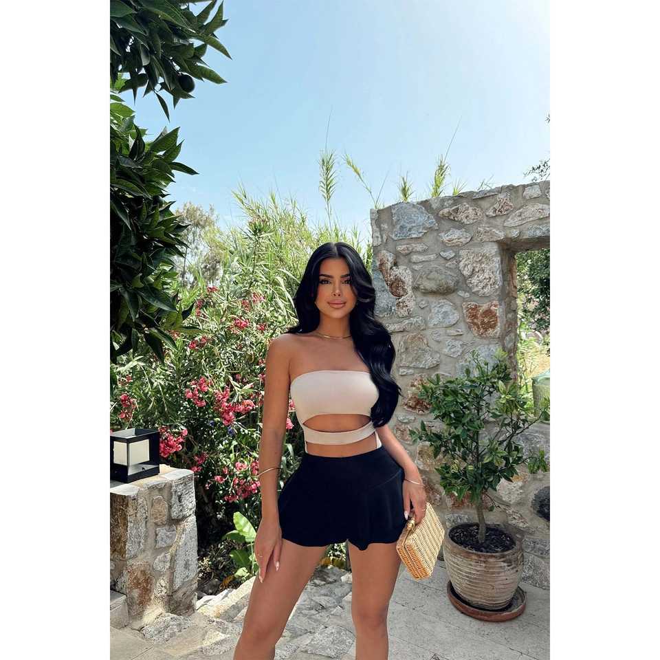 Beige Window Detail Bodysuit Plus Size One-Piece Nylon Knitting Fabric Skinny Fit Above Knee Length Square Neck Print Pattern