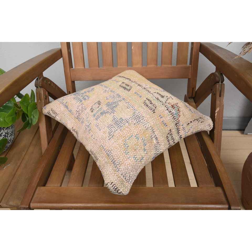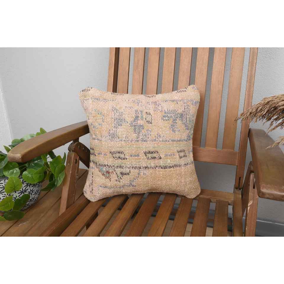 Beige Wool Kantha Patchwork Pillow 14x14 Inch Luxury Vintage Embroidered Fluffy Rustic Throw Pillow for Floor Use
