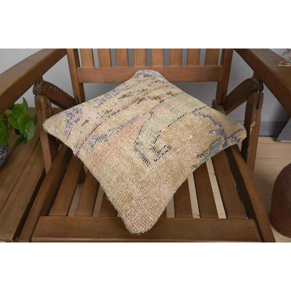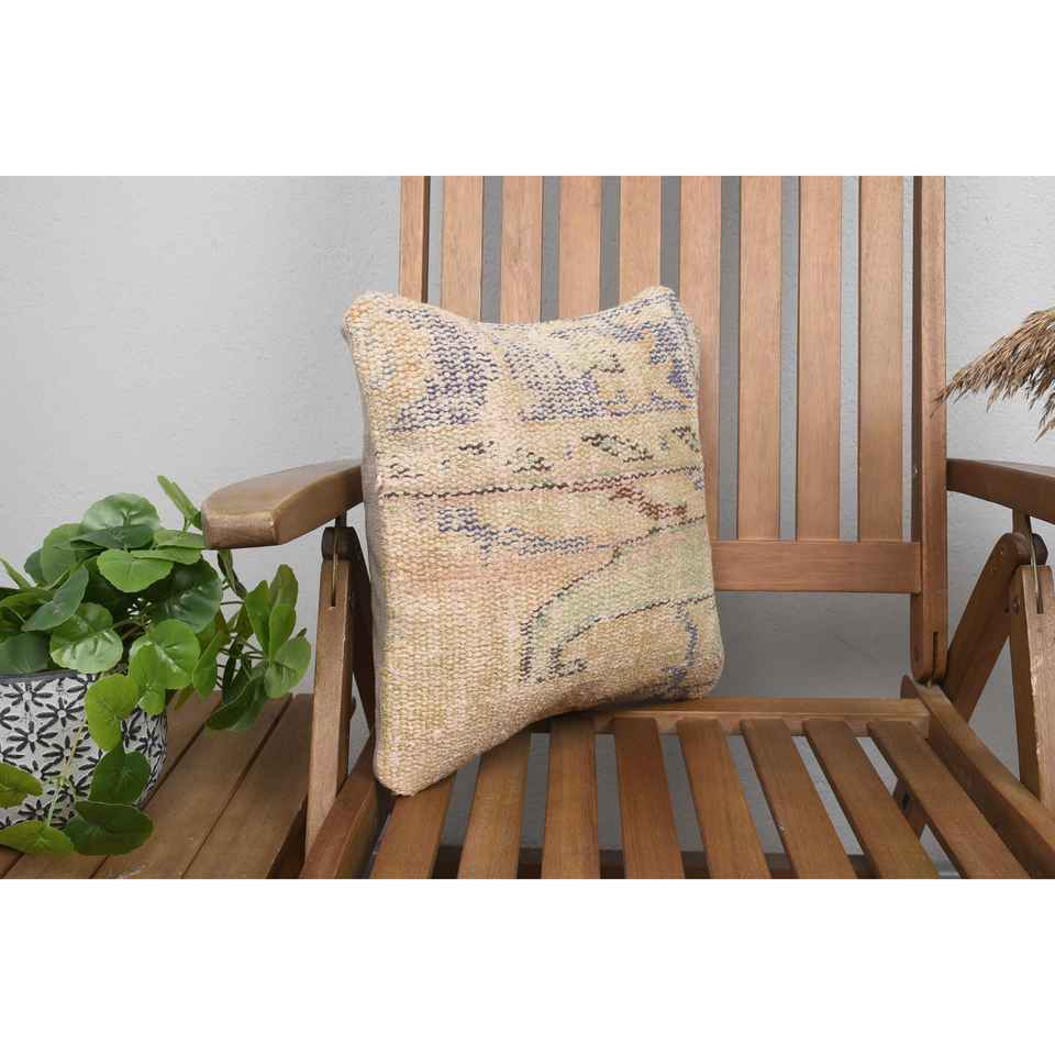 Beige Wool Kantha Patchwork Pillow 14x14 Inch Luxury Vintage Embroidered Fluffy Rustic Throw Pillow for Floor Use