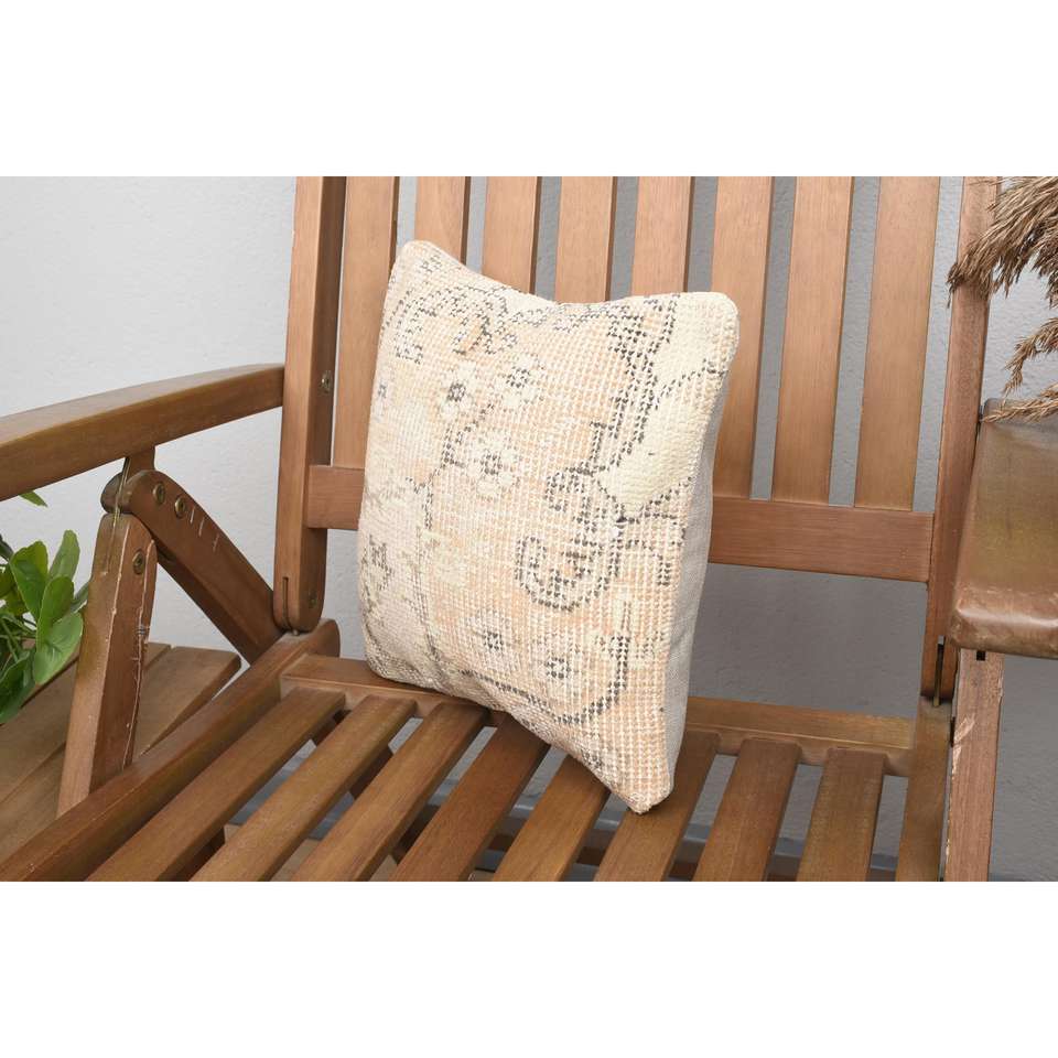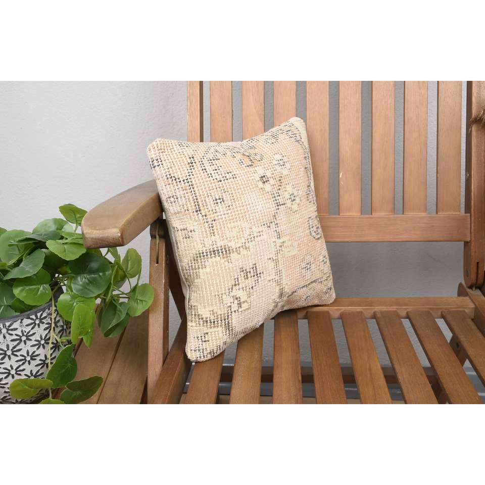 Beige Wool Needlepoint Pillow 12x12 Inch Rustic Patchwork Cushion Woven Technique with Vintage Pattern