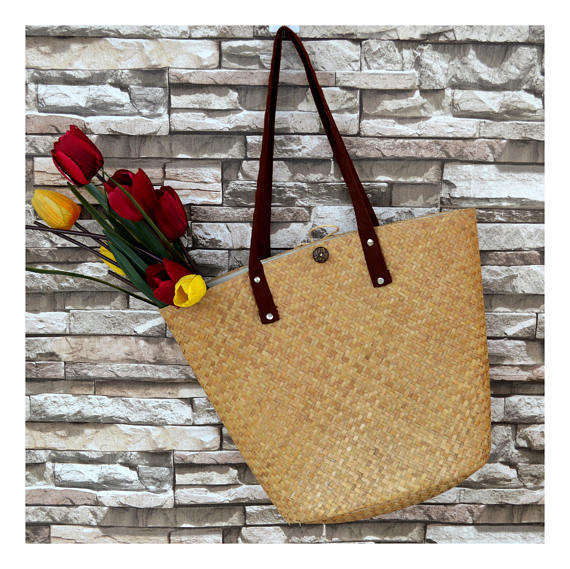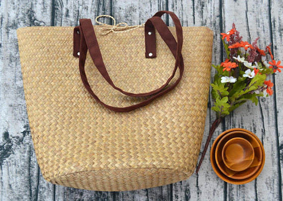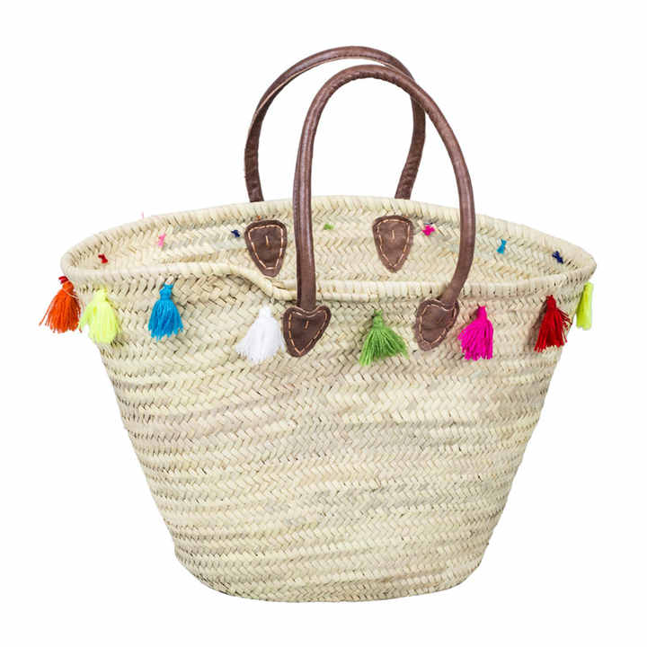 Beige Big Size Shopper Bag Seagrass Handmade Bag with Pom Pom Colorful Seagrass Shopping Bag