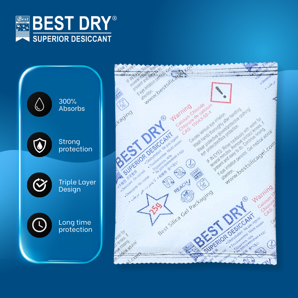 Best Dry Superior Desiccant 25g calcium chloride 300% Moisture Absorber DMF Free Anti-Mold for Electronics Food Closets