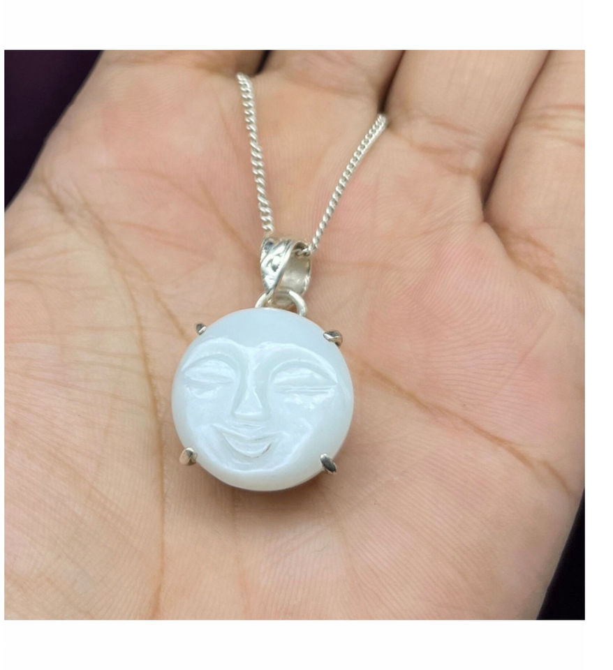 Best Healing 20mm White Pearl Moon Face Carving Pendant Necklace Jewelry 925 Sterling Silver Gold Plated Pendant Handmade Gift