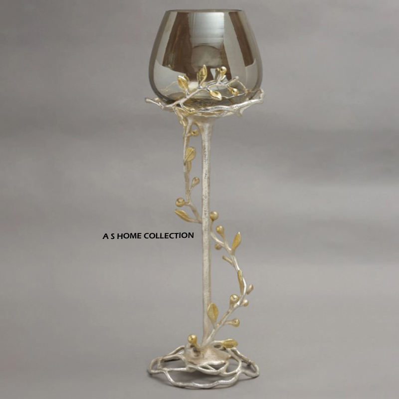 Best Leafy Design Available High Quality Metal and Glass Candle Holder Shiny Gold Color For Home Hotel Interiors or Events