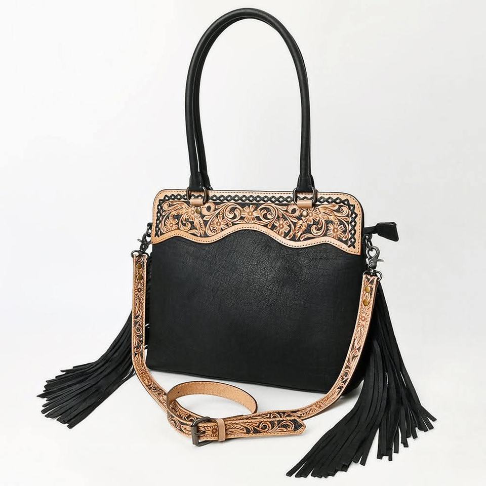 Best Price High Quality Vintage Black Leather Floral Tooled Patch Design Shoulder Bags Purse ZIP Closure Women Two Hot Selling