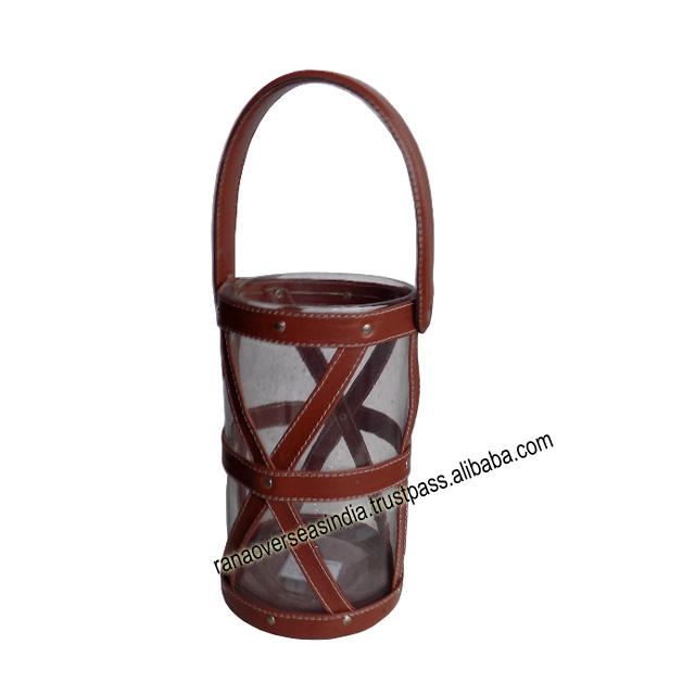 Best Quality Cylindrical Shaped Top on Demand Glass Lantern With Brown Leather Straps for Restaurant Hotel Party Decoration