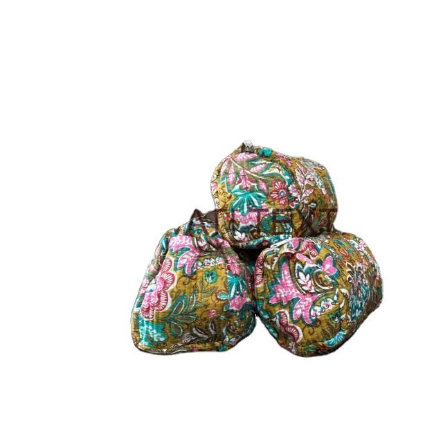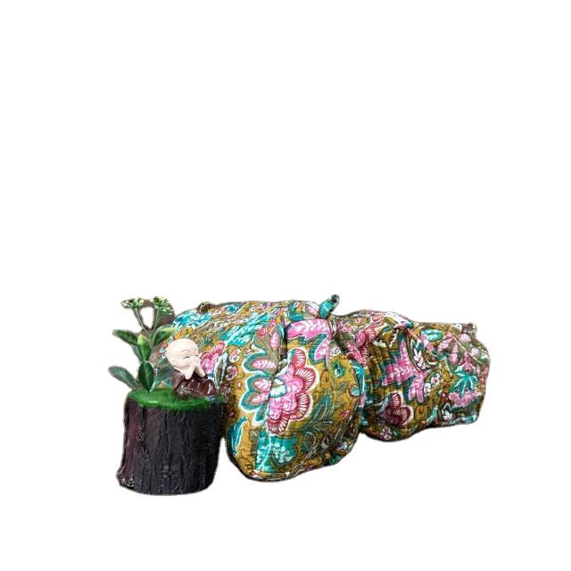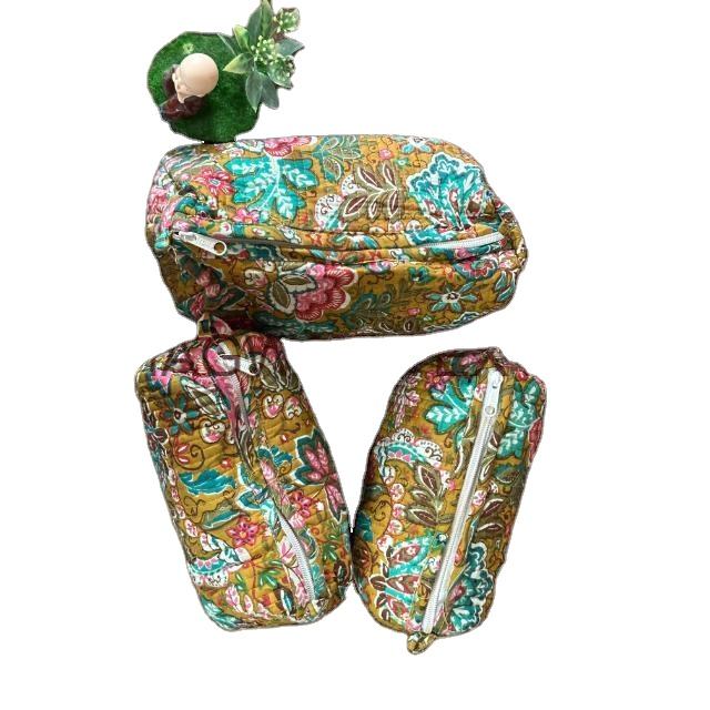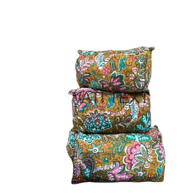 Best Quality Floral Block Printed Indian Handmade Cotton Makeup Bag 3 Pieces Set Quilted Cosmetic Kit Toiletry Pouch
