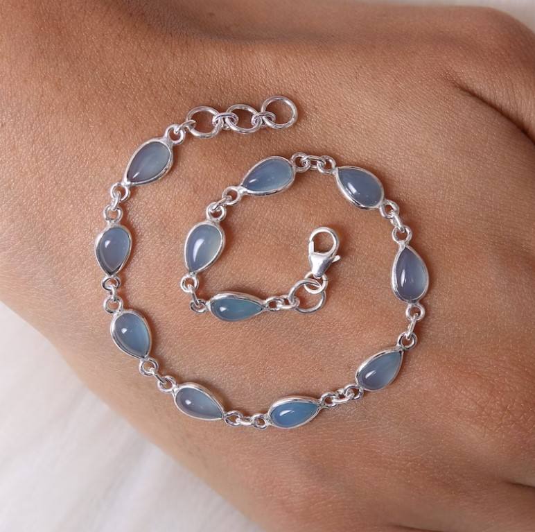 Best Quality Genuine Aqua Chalcedony Pear Smooth Cabochon 7x9mm Bezel Setting Link Chain Fine Handmade Party Wear Bracelet