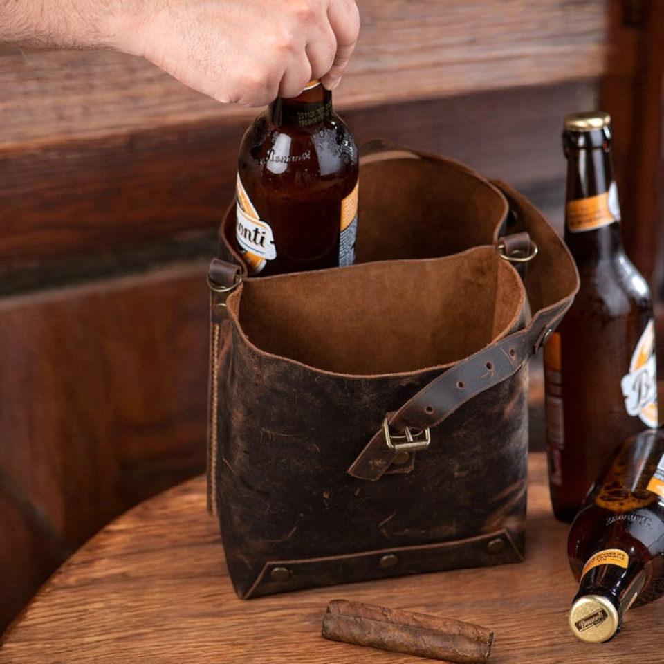 Best Quality Handmade Genuine Leather Water Bottle Carrier Cover Custom Colors & Logo Outdoor Reusable Picnic Bags Factory