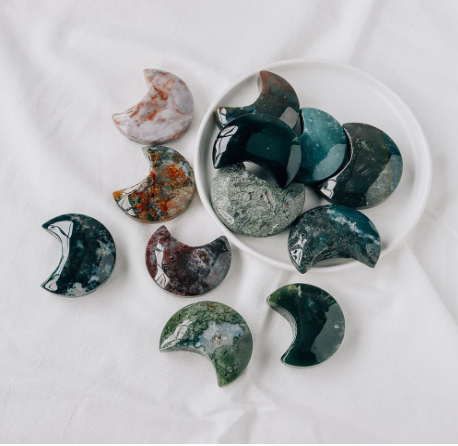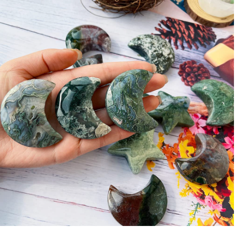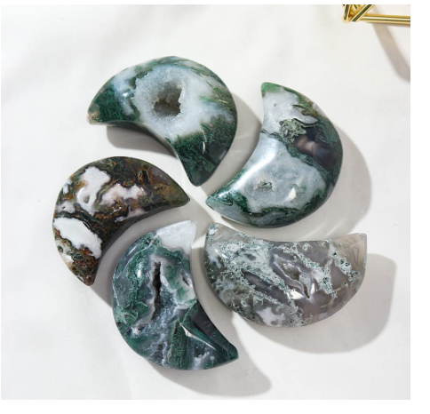 Best Quality Hot Sale Natural Crystal Green Moss Agate Druzy Crystal Cave Cluster Healing Stone Moon Shape Handicraft Ornament