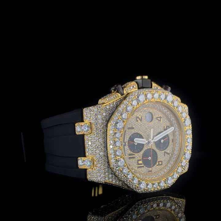 Best Quality Iced Gold Toned Chronograph Subdials Watch Antique Fashion Black Rubber Strap VVS Moissanite Diamond Quartz