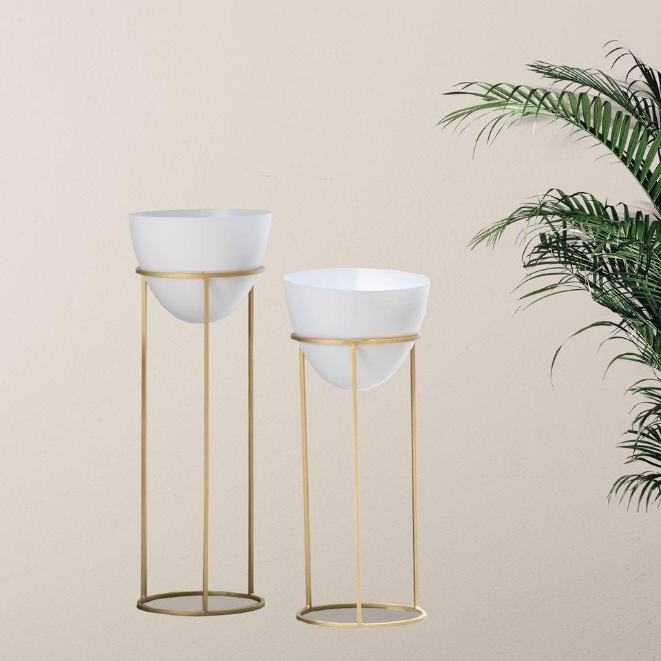 Best Quality Metal Handcrafted White and Golden Outdoor Plant Stand With Planter Pot Manufacturer Indian Factory