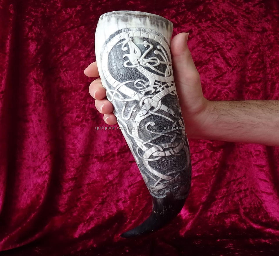 Best Quality Viking Drinking Horn Food-Safe Genuine Ox Horn with Polished Wooden Stand Christmas Decoration