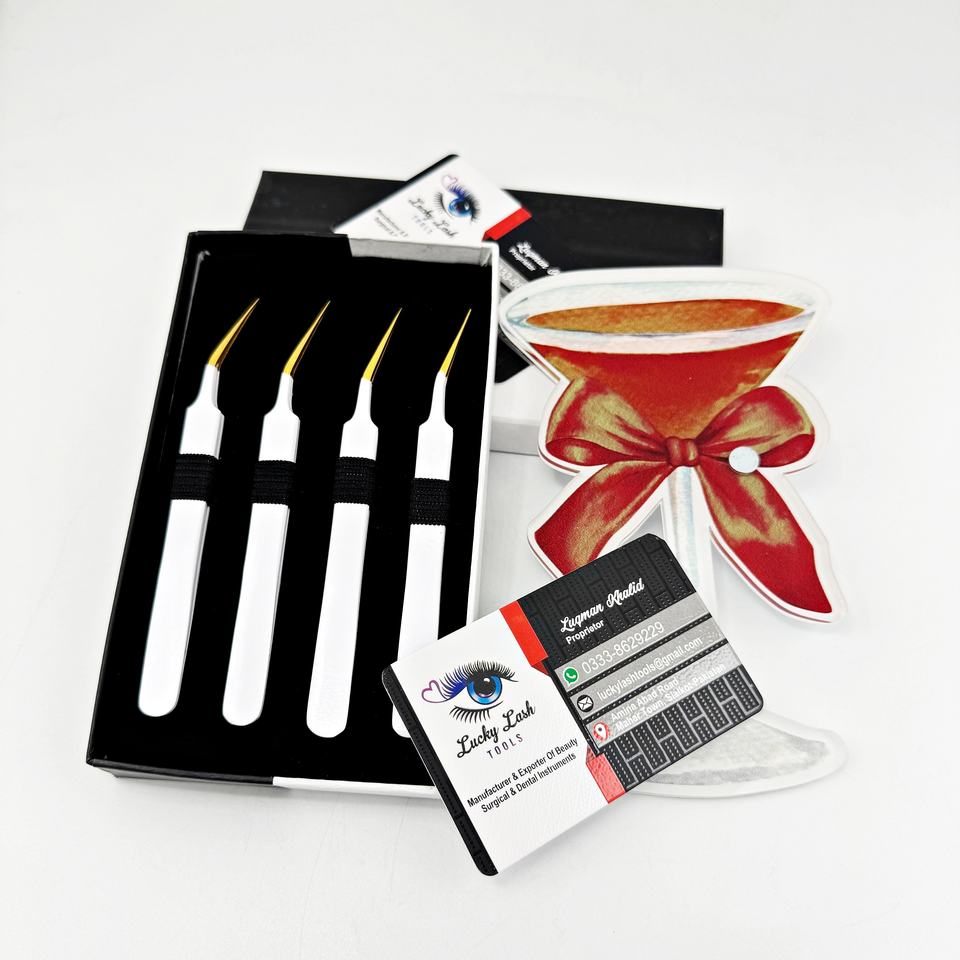 Best Quality White Eyelash Tweezer Set Gold Tip With Lash Tile Isolation Fiber Tip Sustainable Private Logo Hand-Tested Tweezers