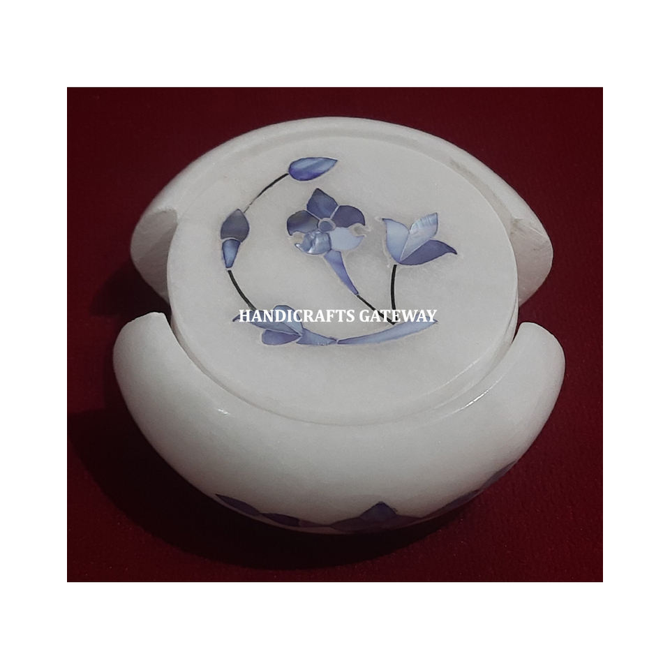 Best Quality White Marble Round Shape Blue Mother Of Pearl Inlay Floral Design Caster Set Use For Put On Water Glass And Tea Cup