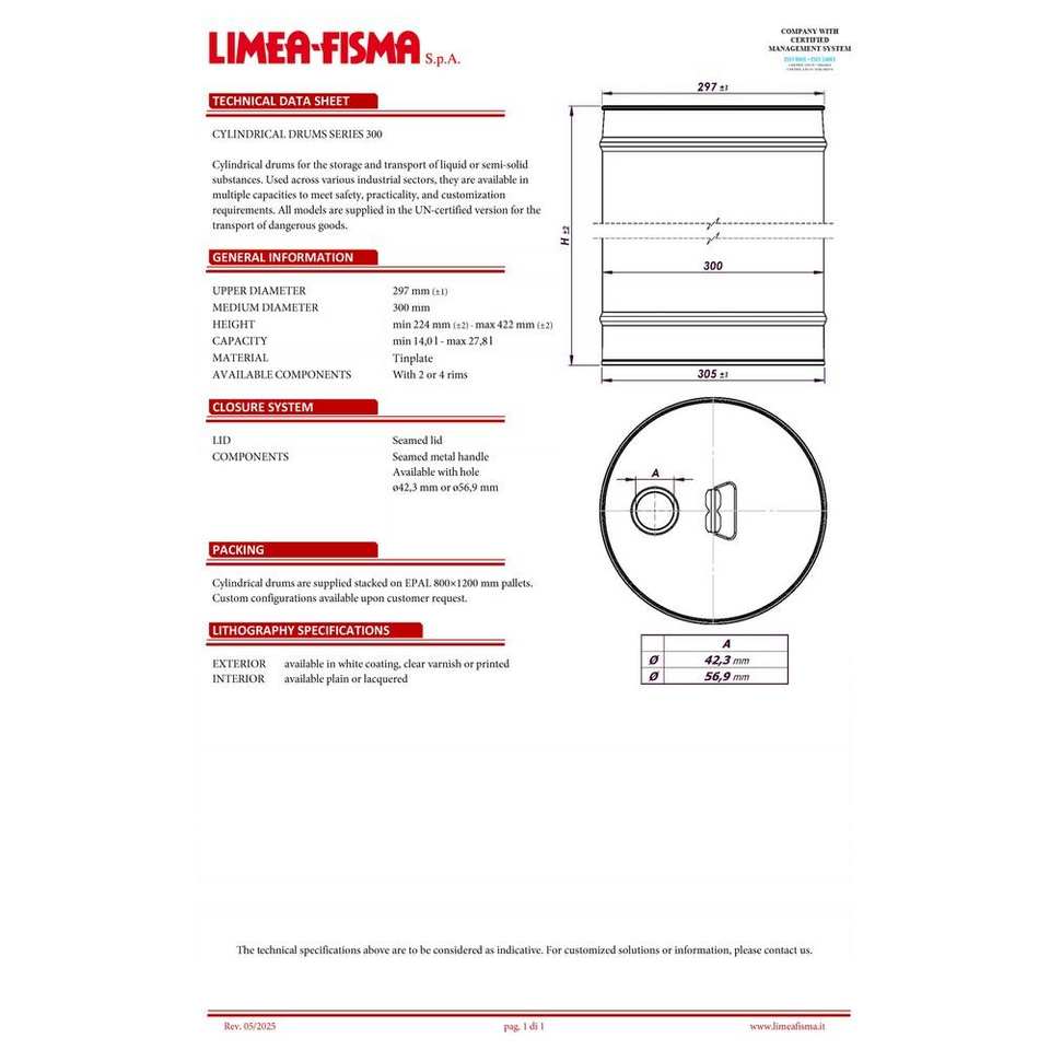 Best Quality tinplate cylindrical drum 300 mm with total capacity from 14 up to 27,8 lt. with handle and pouring hole