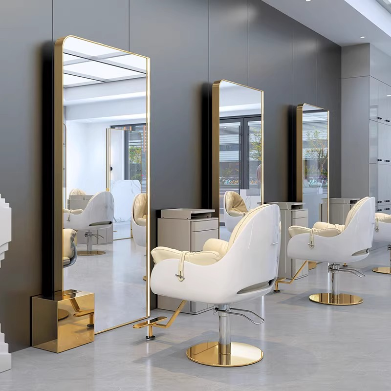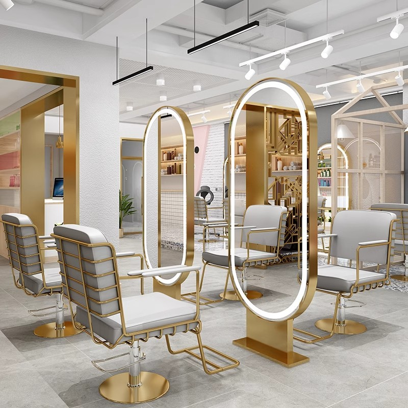 Best Sale Gold Double-Sided Barber Mirror Station for Beauty Salons Metal Frame with LED Light Beauty Salon Floor Mirror
