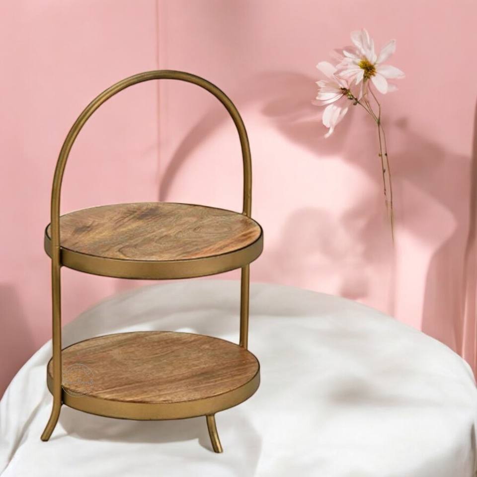 Best Seller 2-Tier Mango Wood and Metal Cake Stand for Christmas Cupcakes and Cookie Serving