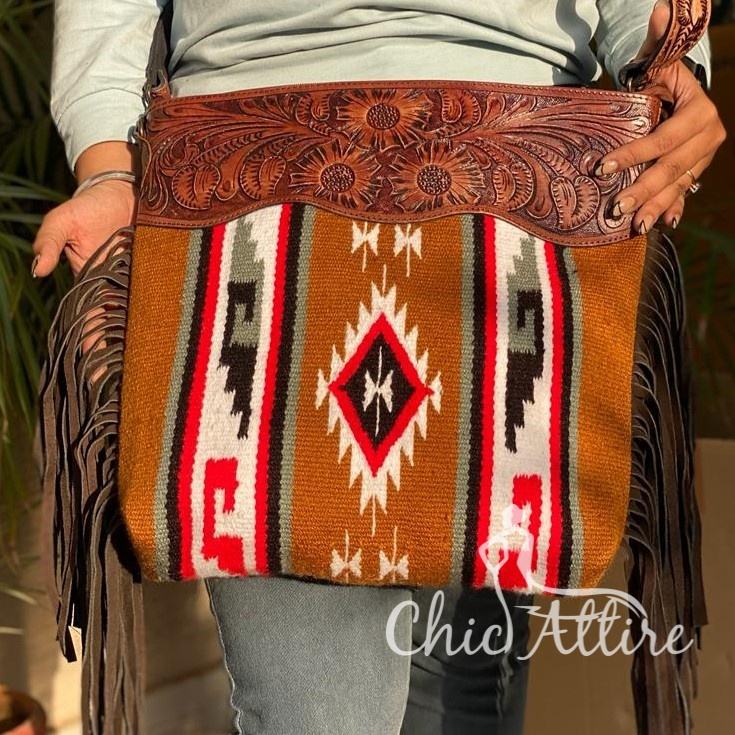 Hand Tooled Saddle Blanket Fringe Crossbody Bag