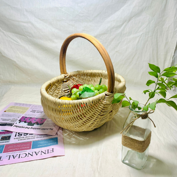 Best Seller Handcrafted Round Rattan Basket with Wooden Handle Natural Wicker Organizer for Fruit, Display & Home Decor