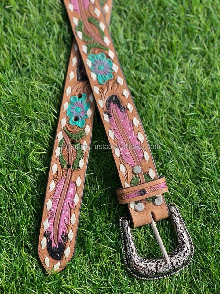 Best Seller Handcrafted Tooled Leather Western Style Turquoise Floral Belt With Buck Stitch Custom Cowhide Leather Cowgirl Belt