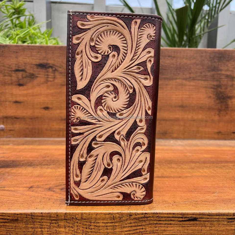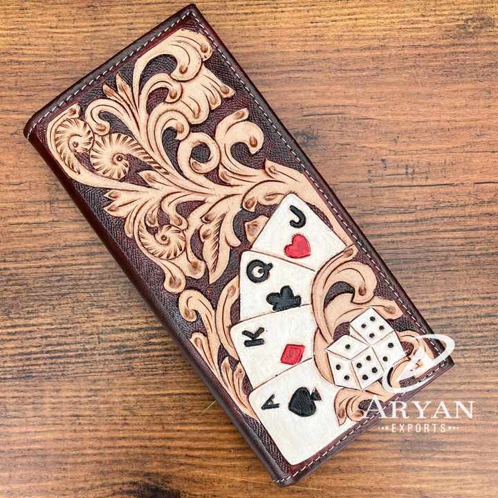Best Seller Handmade Cowboy Genuine Leather Floral Hand Tooled Western Men's Wallet With Deck of Card Hand Carved Men Wallet