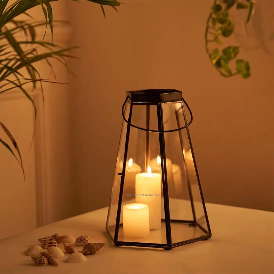 Best Seller Metal Frame Glass Hanging Hurricanes Candle Lantern Black Color for Christmas Event Party Decorations
