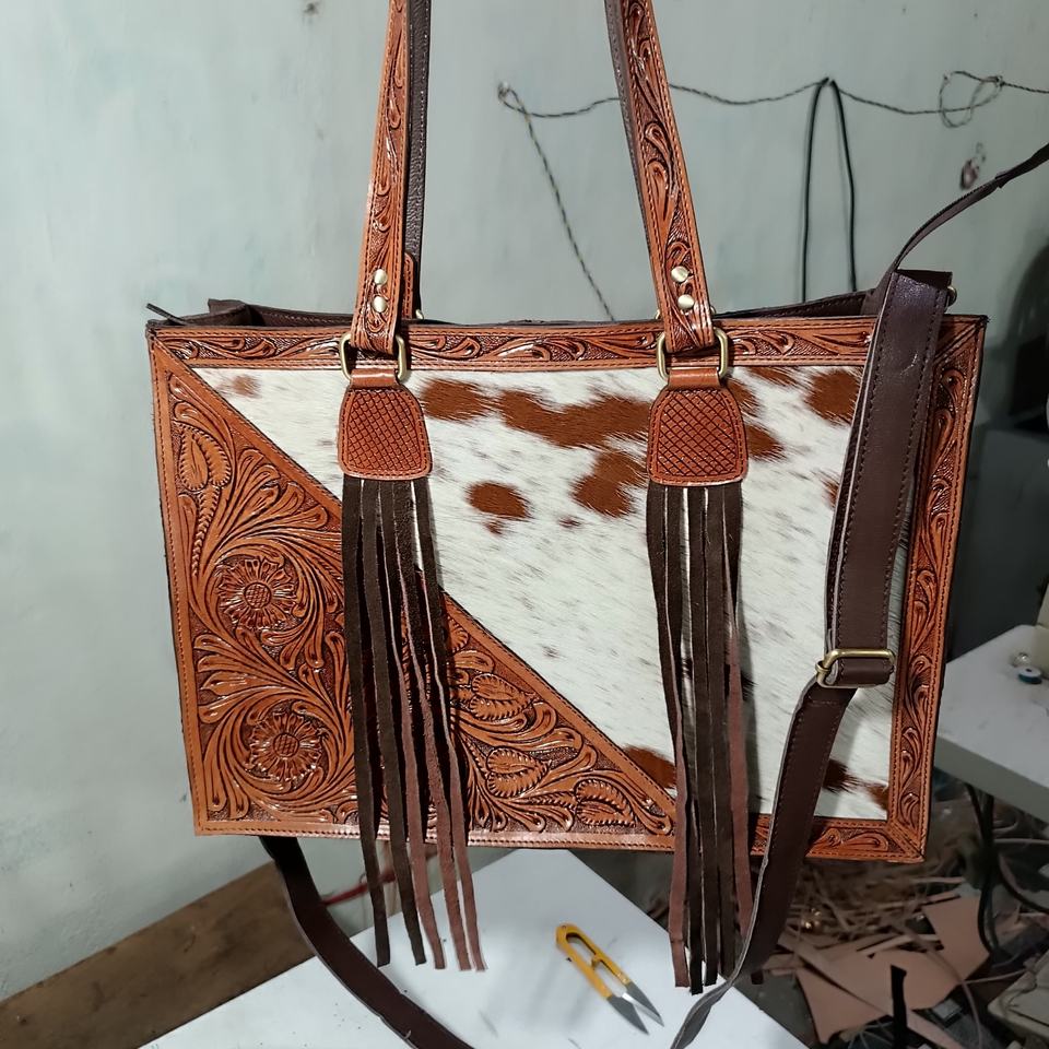 Best Seller Cowhide Tote Bag Western Purse High Quality Cowhide Fur Leather Tote Bag Hand Tooled Leather Western Bag