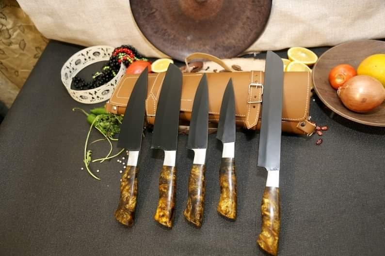 Best Selling 5-Pcs Stainless Steel Handmade Damascus Blade Kitchen Chef Knife Set Full Tang Knives Leather Roll Bag Sharpening