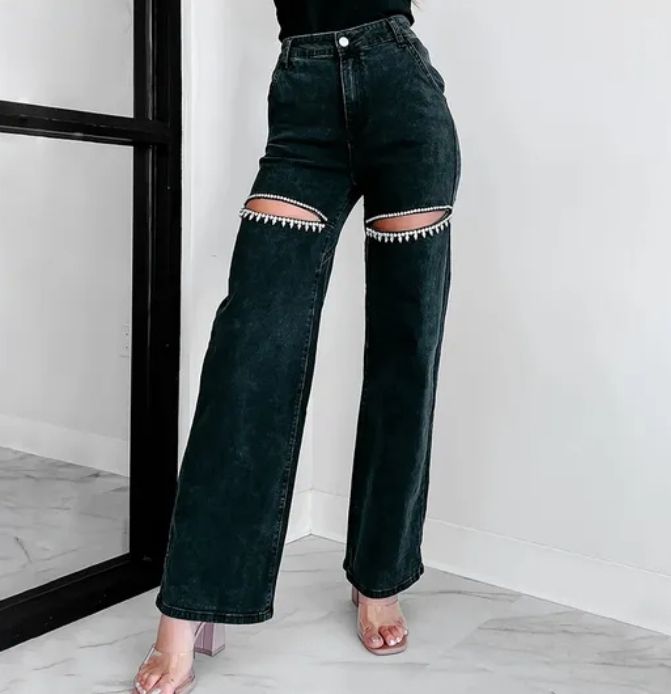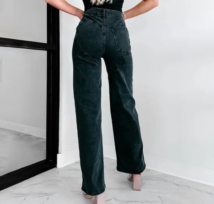 Best Selling Black Denim Wide-Leg Pants Fashion-Forward Chic Appeal with Mid-Waist Knitted Weaving Method Wholesale