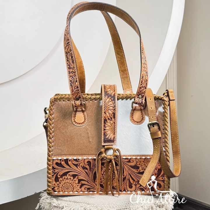 Hand Tooled Cowhide Leather Tassel Tote Bag