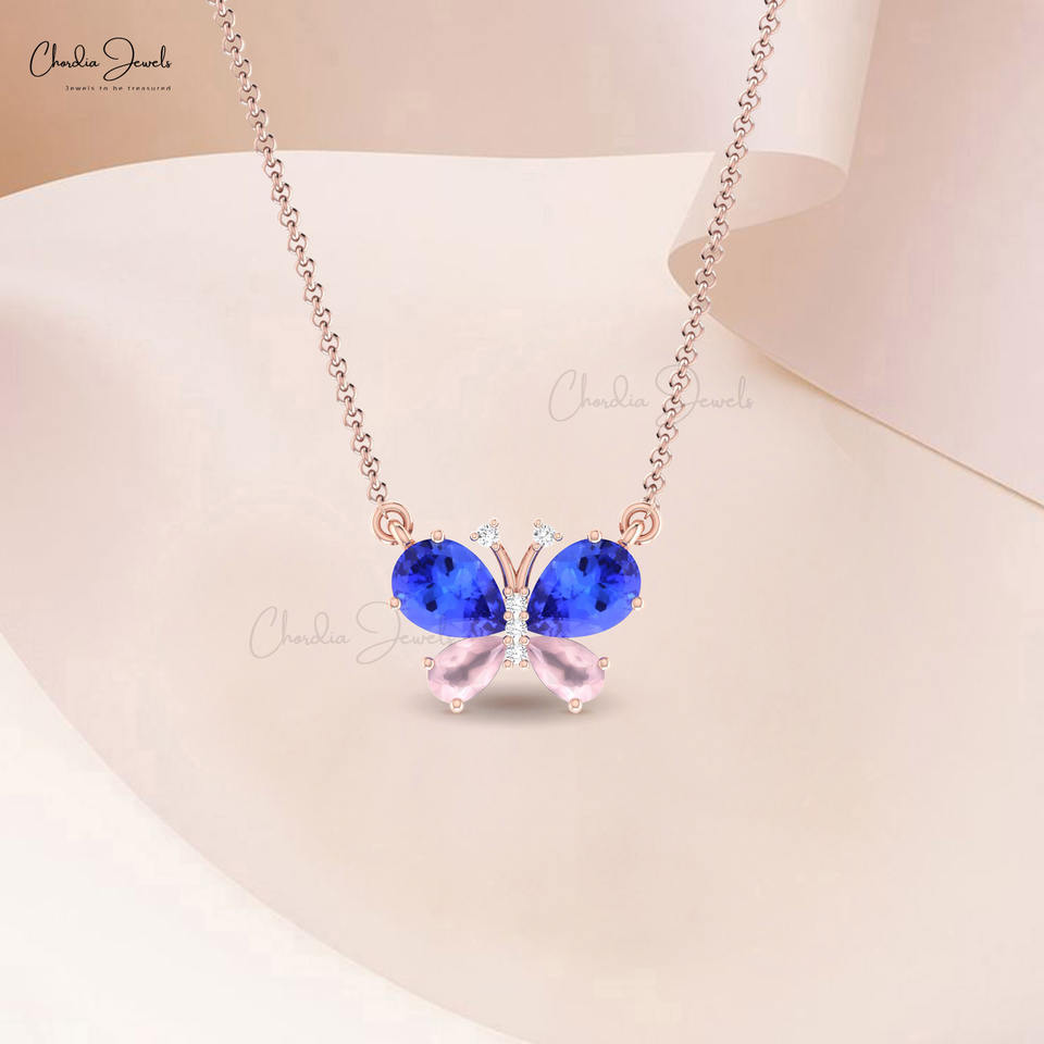 Best Selling Design 7x5mm Pear Cut Tanzanite Butterfly Necklace Real 14k Gold Rose Quartz Cable Chain Necklace Diamond Jewelry