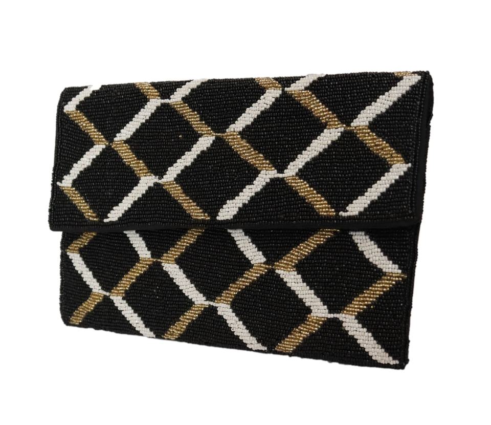 Best Selling Elegant Envelope Style Evening Purse Handmade Black White Beaded Chain Zipper Magnetic Snap Fashion Embroidery