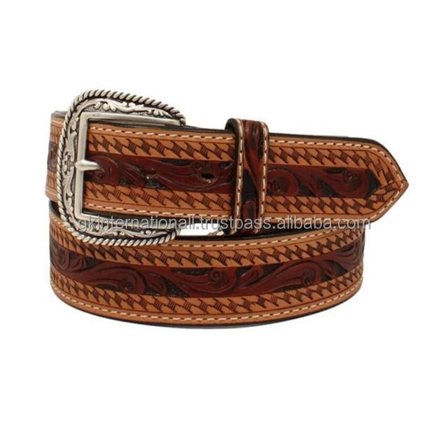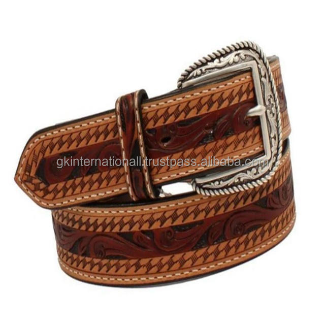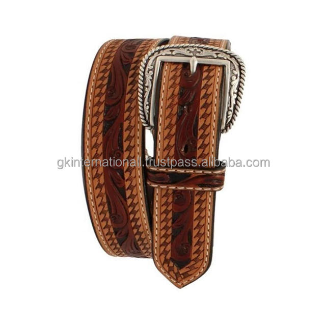 Best Selling Full Grain Hand Carved Basket Embossed Western Leather Tooling belt with designer antique brass buckle set