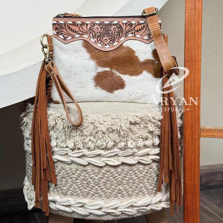 Hand Tooled Cowhide Leather Fringe Crossbody Bag