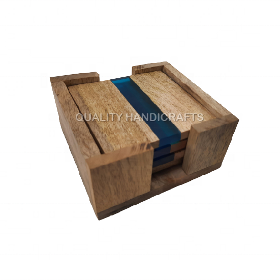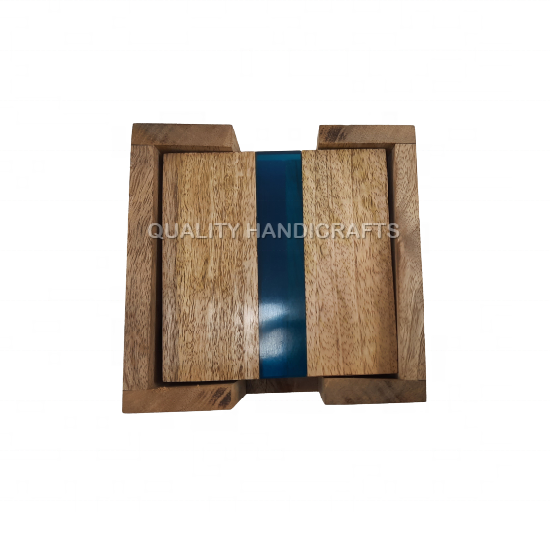 Best Selling India Quality Handicrafts 4-Piece Set Mango Wood Epoxy Resin Coaster with Wooden Holder Square Mat/Pad