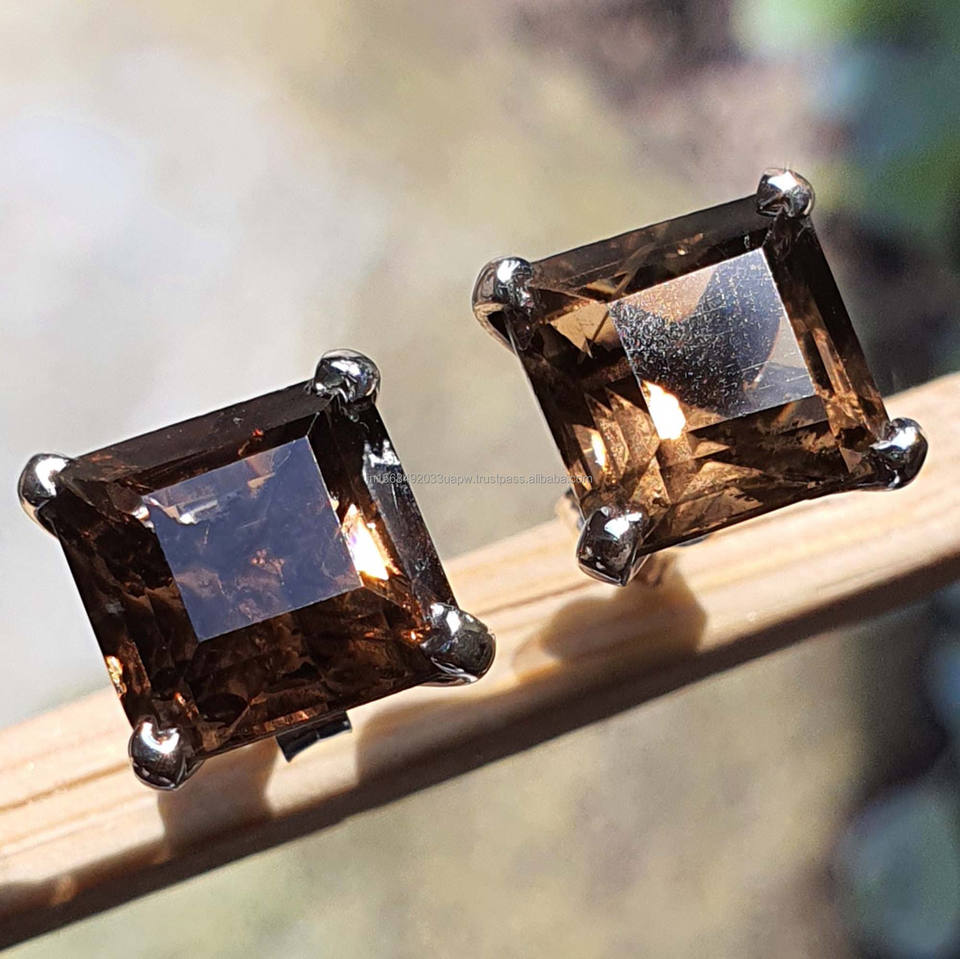 Best Selling Handmade 925 Sterling Silver Square Stud Earrings Gold Diamond Smoky Quartz Gemstone Fine Wedding Piercing Jewelry
