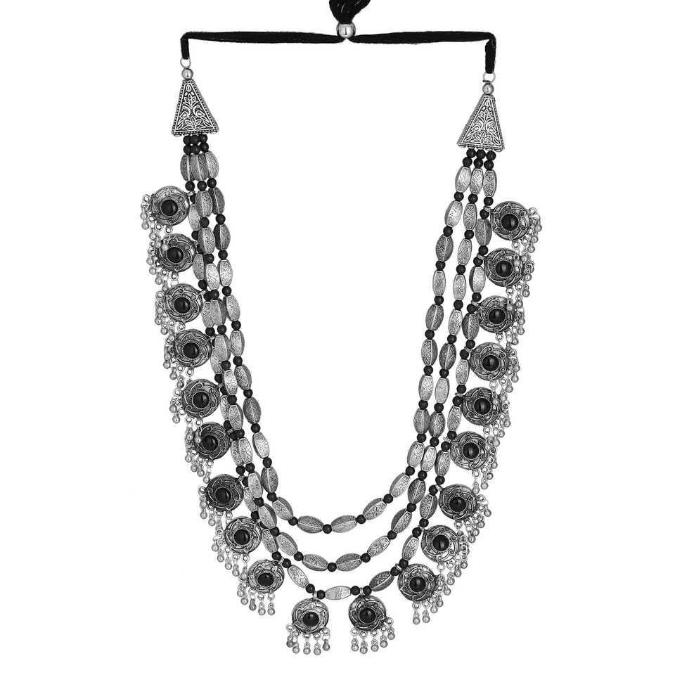 Best Selling High Quality High Grade Oxidised Silver Glamour Multilayer Statement Necklace & Earring Set for Modern Fashion