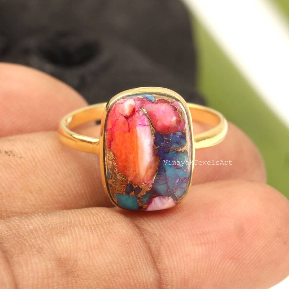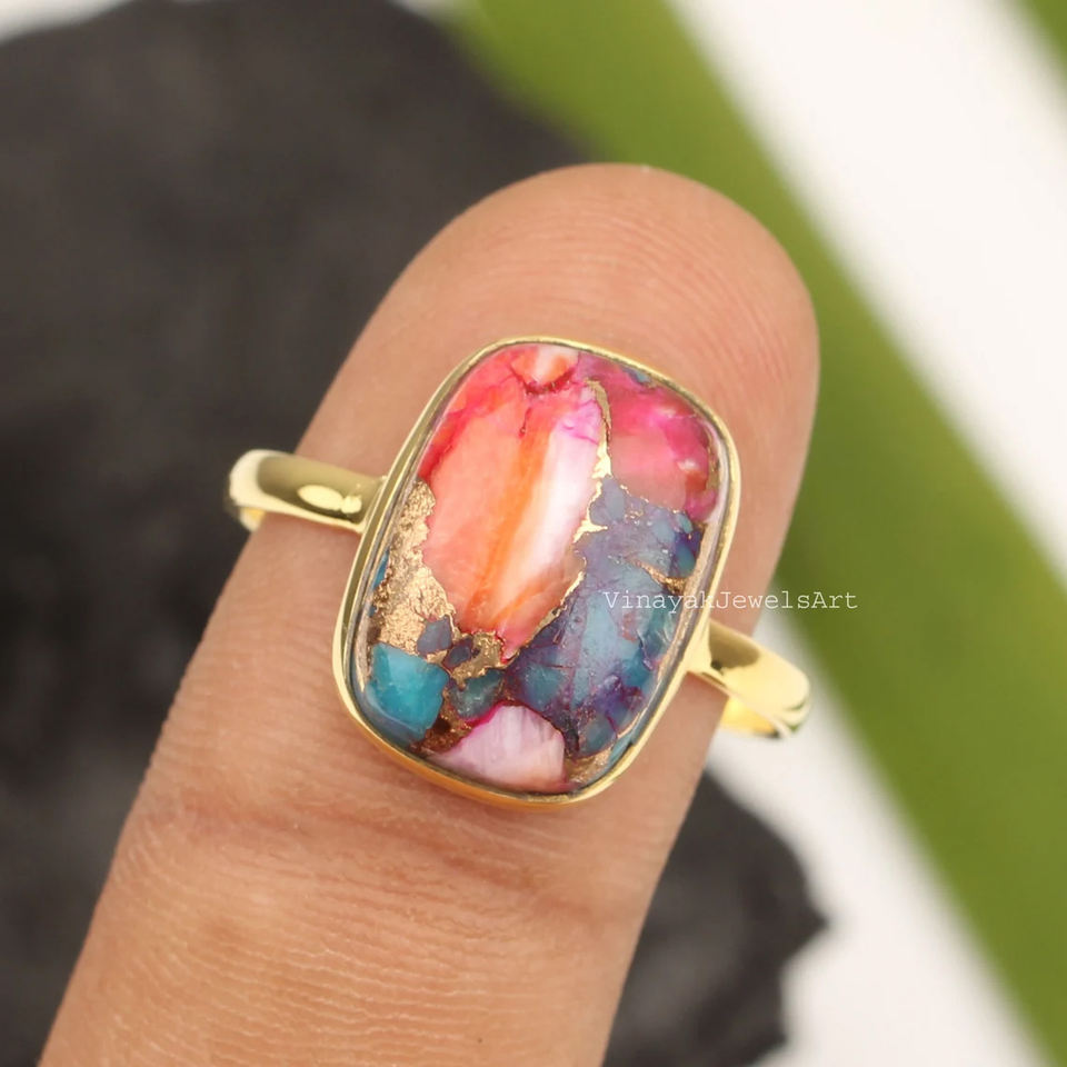 Best Selling Orange Dahlia Copper Turquoise Ring 925 Sterling Silver Fine 10x14mm Cushion Shape 18K Gold Plated Eternity Vermeil