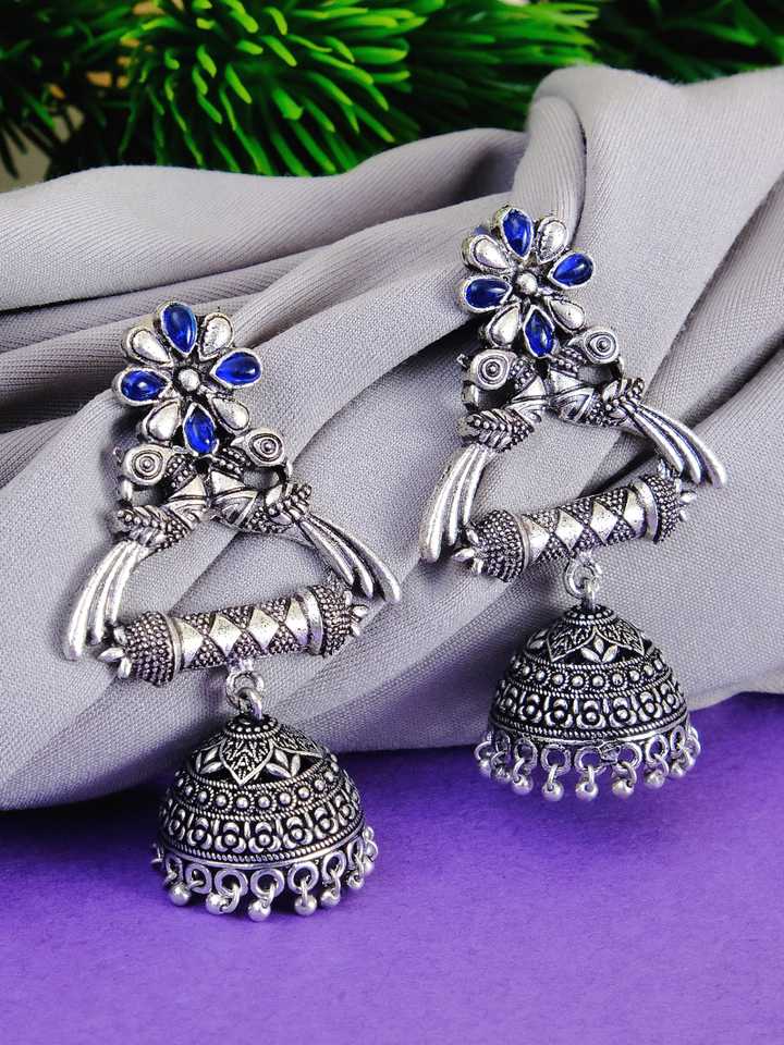 Product Name:Oxidised Silver Plated crystal Studded Peacock Jhumka Earrings