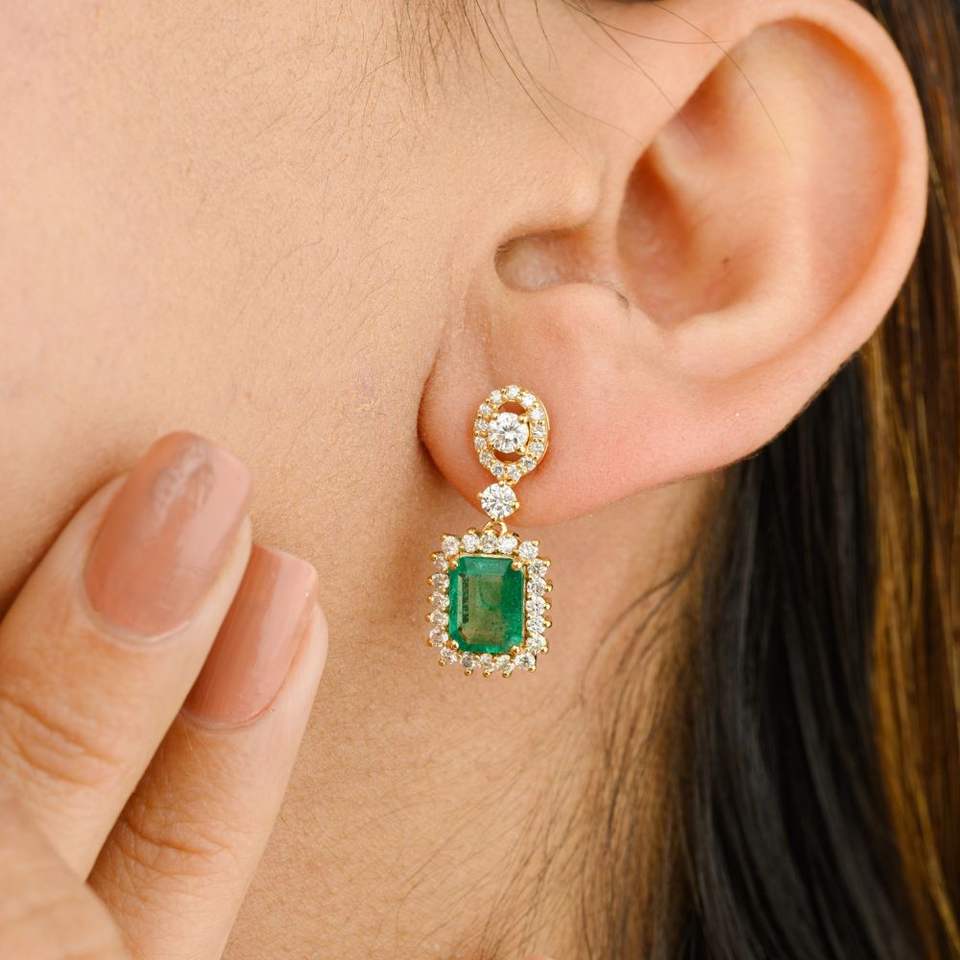 Best Selling Product of Octagon Shape Natural Emerald and Diamond Halo Dangle Earrings 18k Solid Yellow Gold Wholesale Jewelry