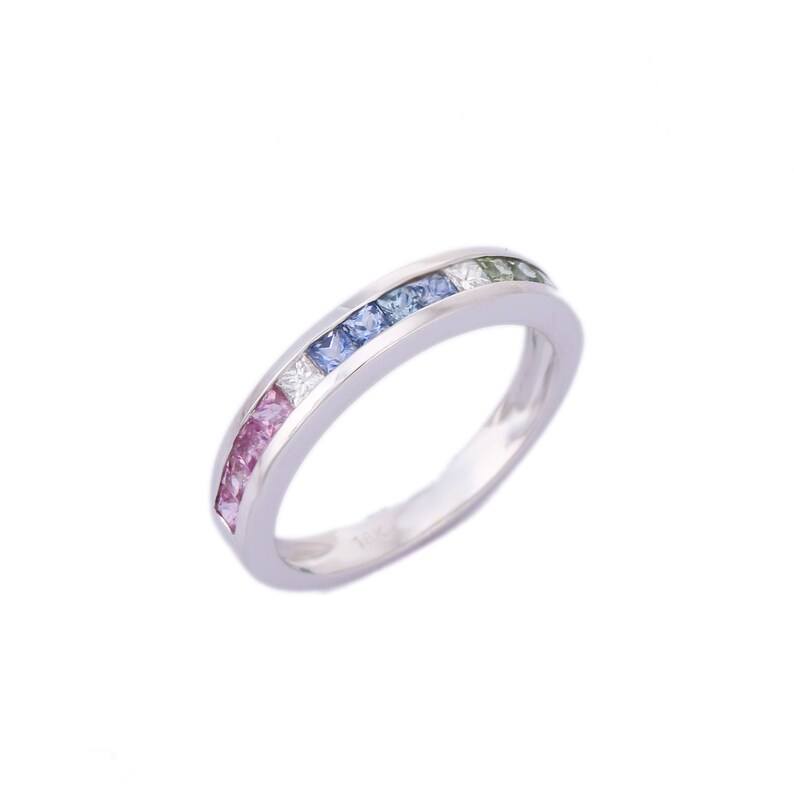 Best Selling Products Natural Square Multi Sapphire With Diamond Gemstone Band Ring 18K Solid White Gold Stackable Rings Jewelry