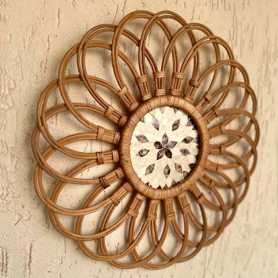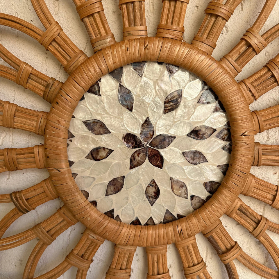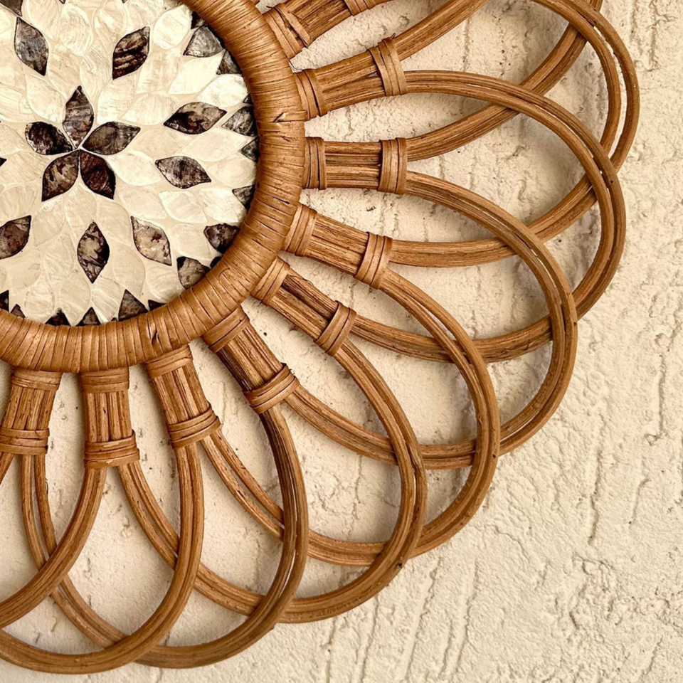 Best Selling Rattan With MOP Wall Decor Wall Art Home Decor Handmade Loop Flower Design Beige Brown Shell Inlay Boho Wall Art